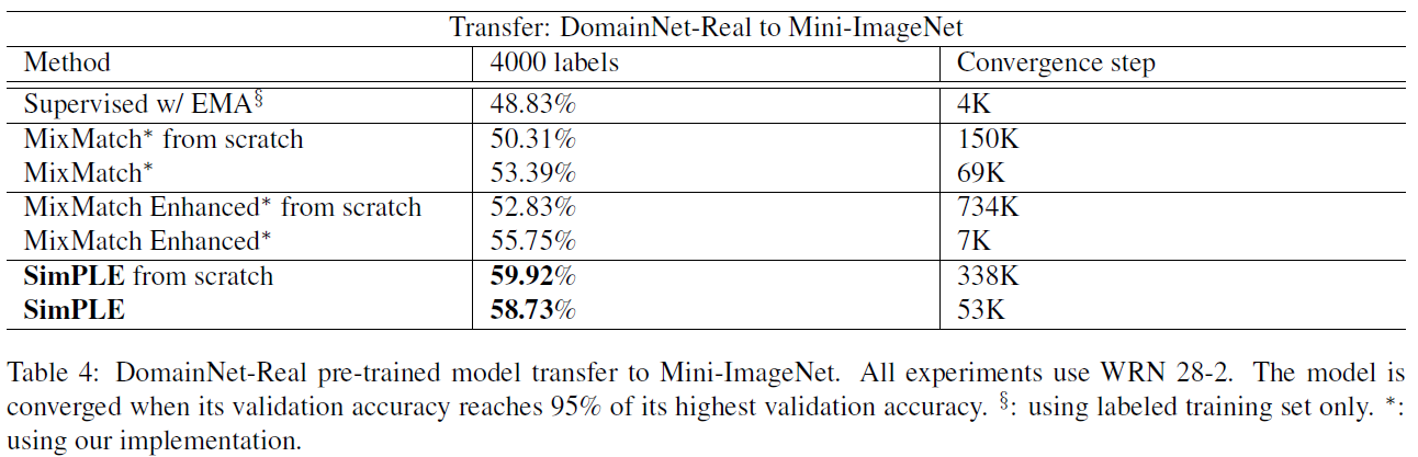 모든 실험에서 Wide ResNet 28-2를 backbone으로 사용했고, AdamW with weight decay를 사용했다. 또한 매 train step마다 exponential moving average(EMA)를 사용했다. 본 실험에서는 MixMatch와의 공정한 비교를 위해 MixMatch에 Augmentation Anchoring을 더한 버젼(MixMatch Enhanced)을 사용했다고 한다. 모든 label을 사용하지 않았을 때 다른 방법들과 비교해 좋은 결과를 얻었다(Table 2, 3).