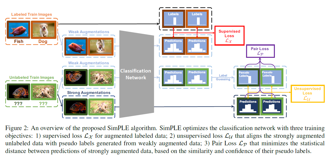 학습 과정에서 샘플들의 미니 배치에 대해, SimPLE는 우선 labeled와 unlabeled 샘플에 weak과 strong augmentation 모두를 가한다. unlabeled 샘플의 pseudo label은 평균을 취해 구하고, unlabeled 샘플을 약하게 augment한 예측값을 sharpen한다. 마지막으로 augment된 샘플과 pseudo label을 이용해 loss term을 최적화한다.