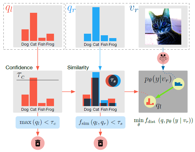 Unlabeled 샘플들 간의 관계를 파악하기 위해 Pair loss term을 사용한다. 이를 통해 다른 unlabeled 샘플들 간 정보가 implicit하게 전파되도록 한다. Pair loss에선 unlabeled point p의 high confidence pseudo label을 anchor로 사용한다. pseudo label이 p와 유사한 unlabeled 샘플들은 그들의 prediction을 심한 perturbation에도 anchor에 align해야 한다. Fig 3에서 이 선정 process를 보여준다. similarity threshold는 confidence threshold를 adaptive하게 확장시켰다. Pseudo confidence가 threshold 아래에 있는 샘플들은 loss에 의해 선택될 수 있고, 높은 confidenc level로 push된다. Pair loss는 다음과 같이 정의한다. $$ L_{P} = \frac{1} {\binom{K'B}{2}}\sum_{i,j\in[|U'|], i\neq j,(v_{l},q_{l})=U_{i}',(v_{r},q_{r})=U_{j}'}\varphi_{\tau_{c}}(max(q_{l}))\ \ \ \ (6) $$$$ \varphi_{\tau_{s}}(f_{sim}(q_{l},q_{r})),\ \ \ f_{dist}(q_{l},p_{model}(\tilde{y}|v_{r};\theta)) $$\(\tau_{c}, \tau_{s}\)는 confidence threshold와 similarity threshold를 나타낸다. \(\varphi_{t}(x) = 1_{x>t}x\)는 threshold t에 의해 조절되는 threshold function이다. \(f_{sim}(p,q)\)는 두 probability vector p, q의 유사성을 측정한다(\(f_{sim}(p,q) = \sqrt{p}^{T} \sqrt{q}\ \ \ \ (7)\)). \(f_{sim}(p,q) \in [0,1]\)이므로, distance function \(f_{dist}(p,q) = 1-f_{sim}(p,q)\)로 사용한다.