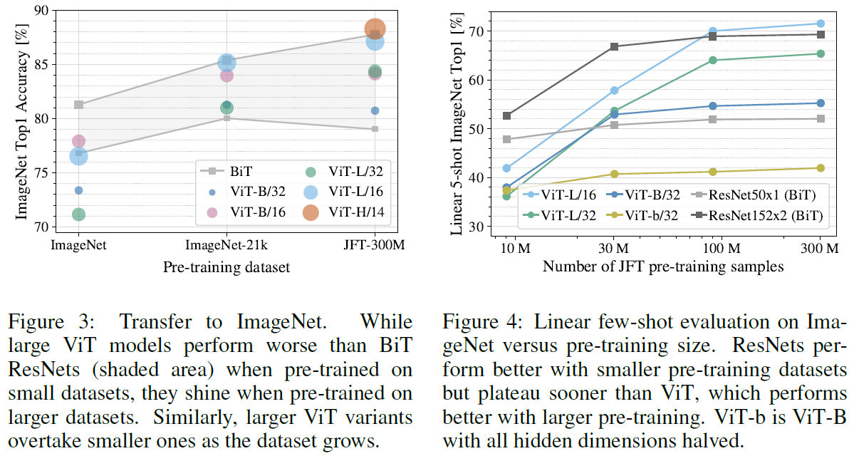 우선, ViT모델을 증가하는 크기의 데이터셋으로 pre-train시킨다. 작은 데이터셋에서 성능을 올리기 위해, 세가지 regularization 파라미터를 optimize한다(weight decay, dropout, label smoothing). Fig 3에서 보면, 가장 작은 데이터셋인 ImageNet에서 finetune한 결과를 볼 수 있다. Fig 3에서 알 수 있듯, ViT-Large 모델들은 regularization에도 불구하고 ViT-Base 모델들보다 성능이 나오지 않는다. JFT-300M을 사용할 때만, 큰 모델의 이점을 잘 살릴 수 있었다. 작은 데이터셋(ImageNet)에서는 BiT CNN이 ViT보다 성능이 좋았지만, 큰 데이터셋에는 ViT가 성능이 더 좋아졌다.
