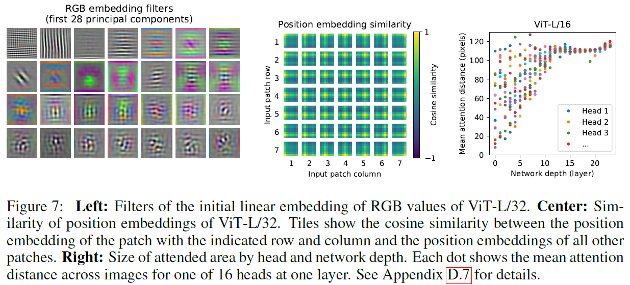 ViT의 작동 원리를 확인하기 위해 내부에서의 표현을 분석해 보았다. ViT의 첫 layer은 flatten된 패치를 lower dimension 공간으로 linearly project한다(1). Fig 7-Left는 학습된 embedding 필터의 주요 compoenet를 보여준다. Component들은 각 패치들 안에서 fine structure의 저차원 representation을 나타내는 그럴듯한 basis function을 닮았다. Fig 7-Center은 모델이 이미지 내의 거리를 encode하는 법을 position embedding과 유사하게 학습한다는 것을 보여준다. 예를 들어, 가까운 패치들은 유사한 position embedding을 가지는 경향을 보인다. 또한, 동일한 row나 column에 있는 패치들은 유사한 embedding을 보인다. 마지막으로 sinusoidal 구조는 더 큰 grid에서 명백하다. Position embedding은 2D 이미지 배치를 표현하도록 학습한다는 것은 수작업된 2D aware embedding이 왜 발전을 보이지 않는지 설명한다.
