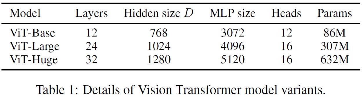 'Base'와 'Large' 모델은 BERT에서 그대로 사용했고, 추가적으로 더 큰 'Huge' 모델을 추가했다. ViT-L/16의 경우는 'Large' 변형을 사용했고, 16x16 입력 패치 크기를 사용했다는 뜻이다. 트랜스포머의 sequence 길이는 패치 크기의 제곱에 반비례하기 때문에, 작은 패치 크기를 가진 모델들은 연산 비용이 많이 든다.